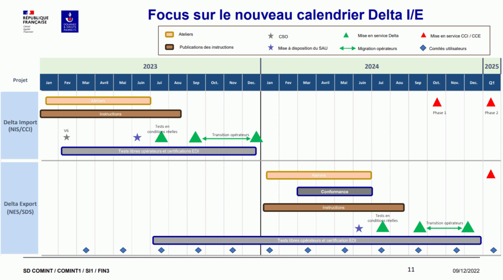 - Avril 2024 : Mise à jour des régimes douaniers (44 et 49) et impact de la fin des déclarations FR (FR4051). Cette période verra également l’introduction d’une nouvelle note cadre sur le dédouanement dans DELTA IE.